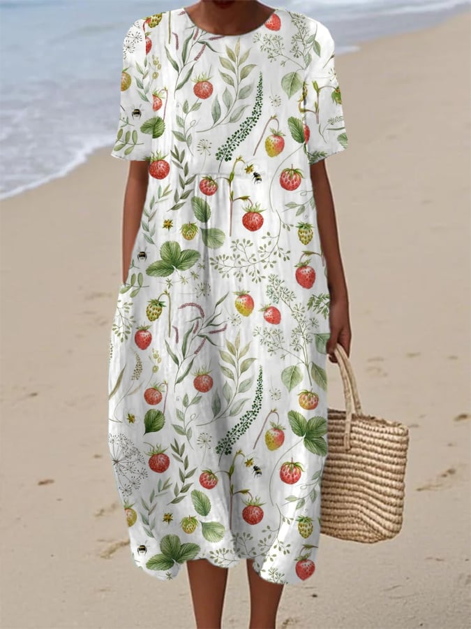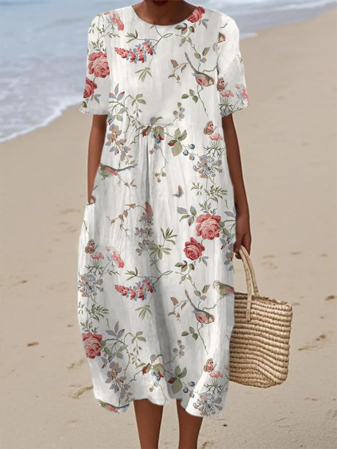 Women's Retro Botanical Floral Print Casual Round Neck Short Sleeve Dress
