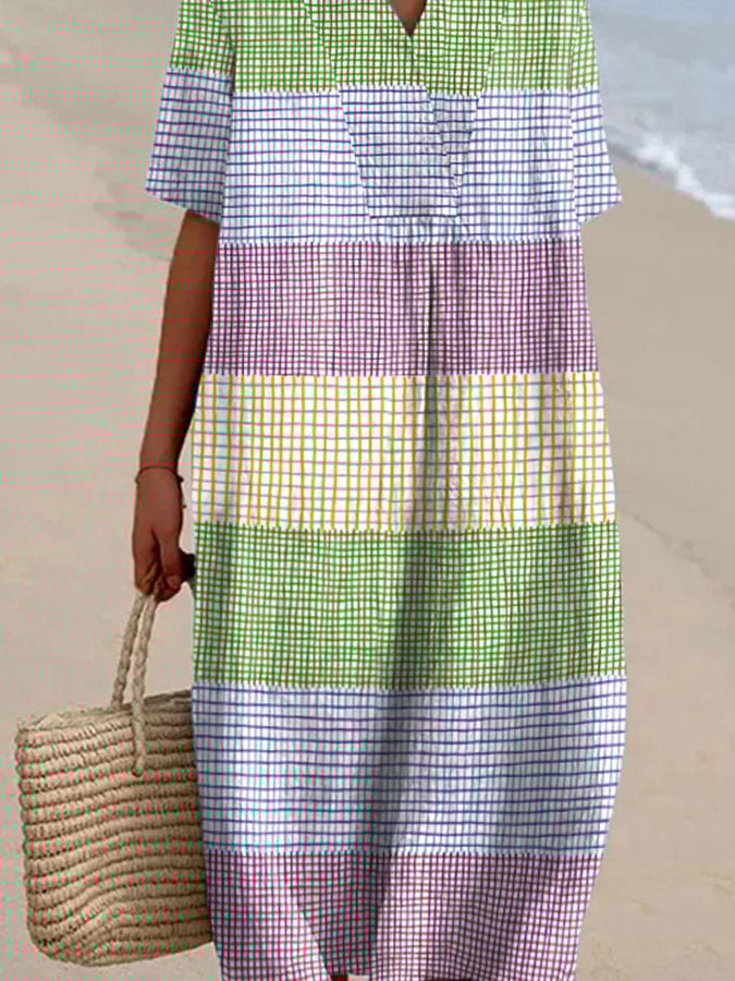 Women's Casual Retro Color Block Loose Short Sleeve Dress