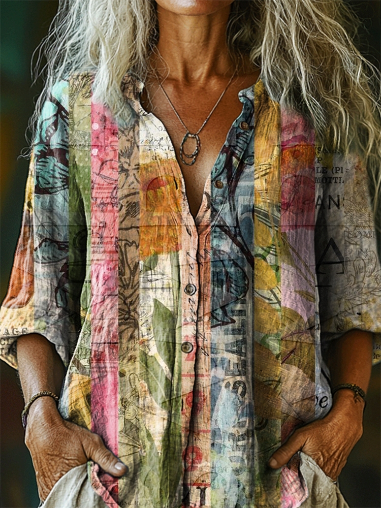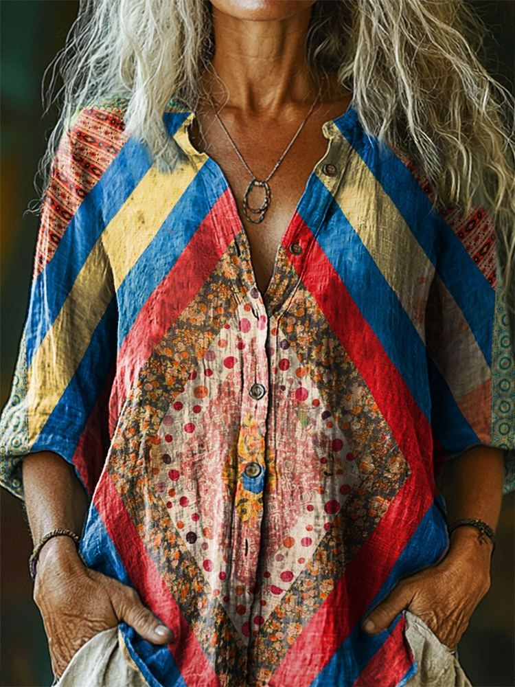 Women's Vintage Colorful Stripe Pattern Art Print Casual Cotton Linen Shirt