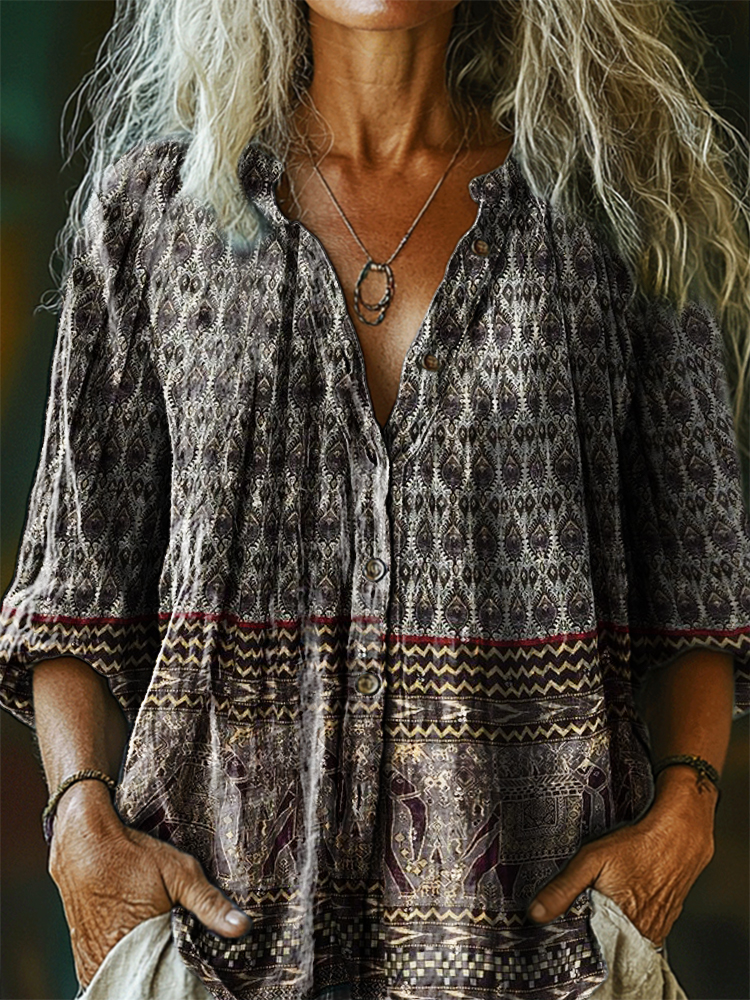 Women's Vintage Bohemian Pattern Art Print Casual Cotton Linen Shirt