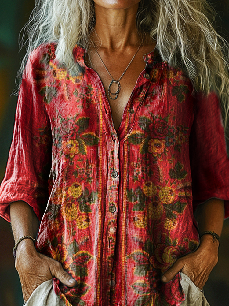 Women's Vintage Bohemian Floral Art Print Casual Cotton Linen Shirt