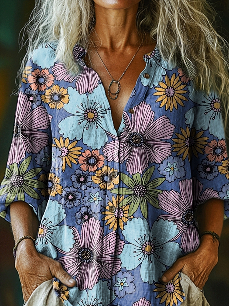 Women's Bohemian Floral Art Print Casual Cotton Linen Shirt