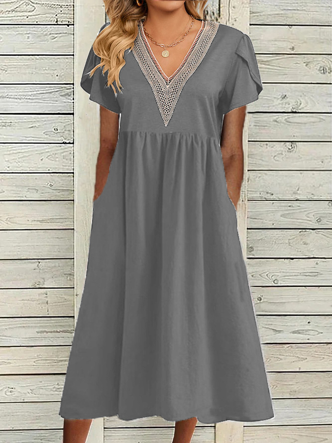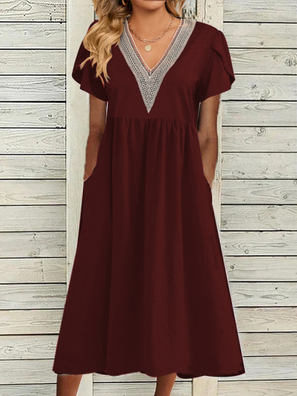Elegant V Neck Lace Pocket Short Sleeve Dress