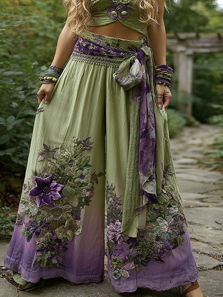 Floral Embroidered Art Print Loose Linen Blend Pants