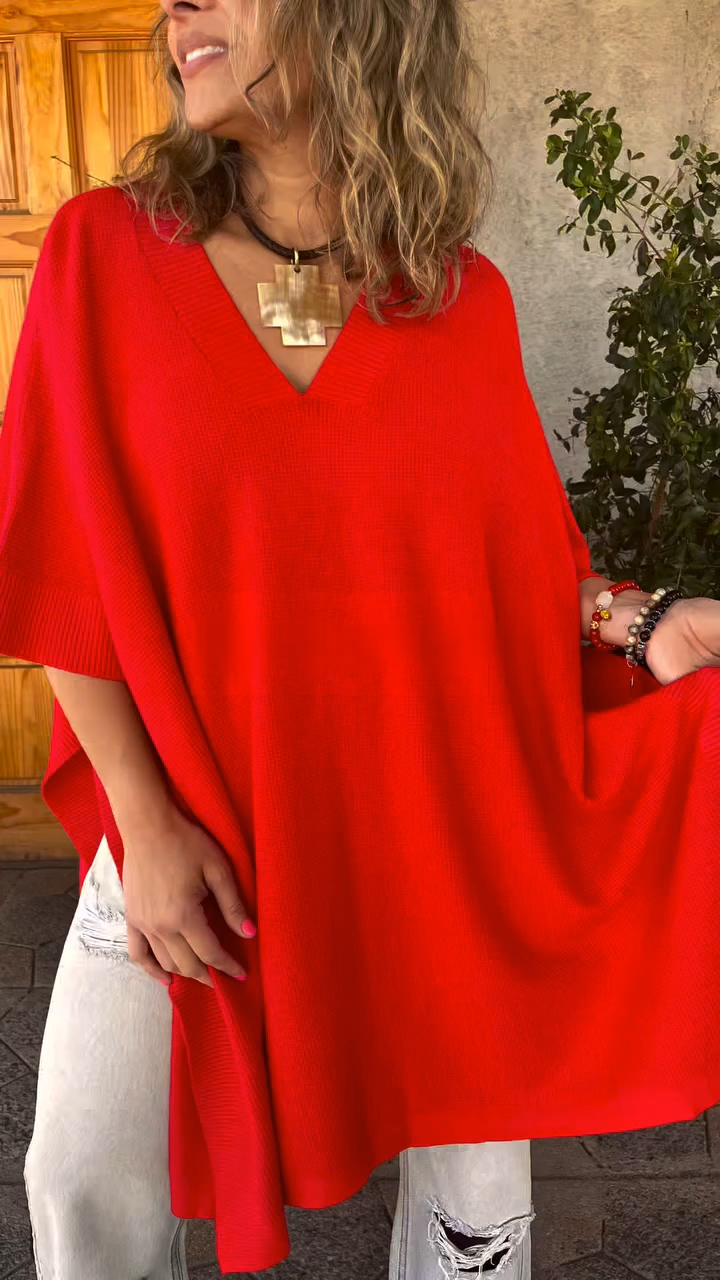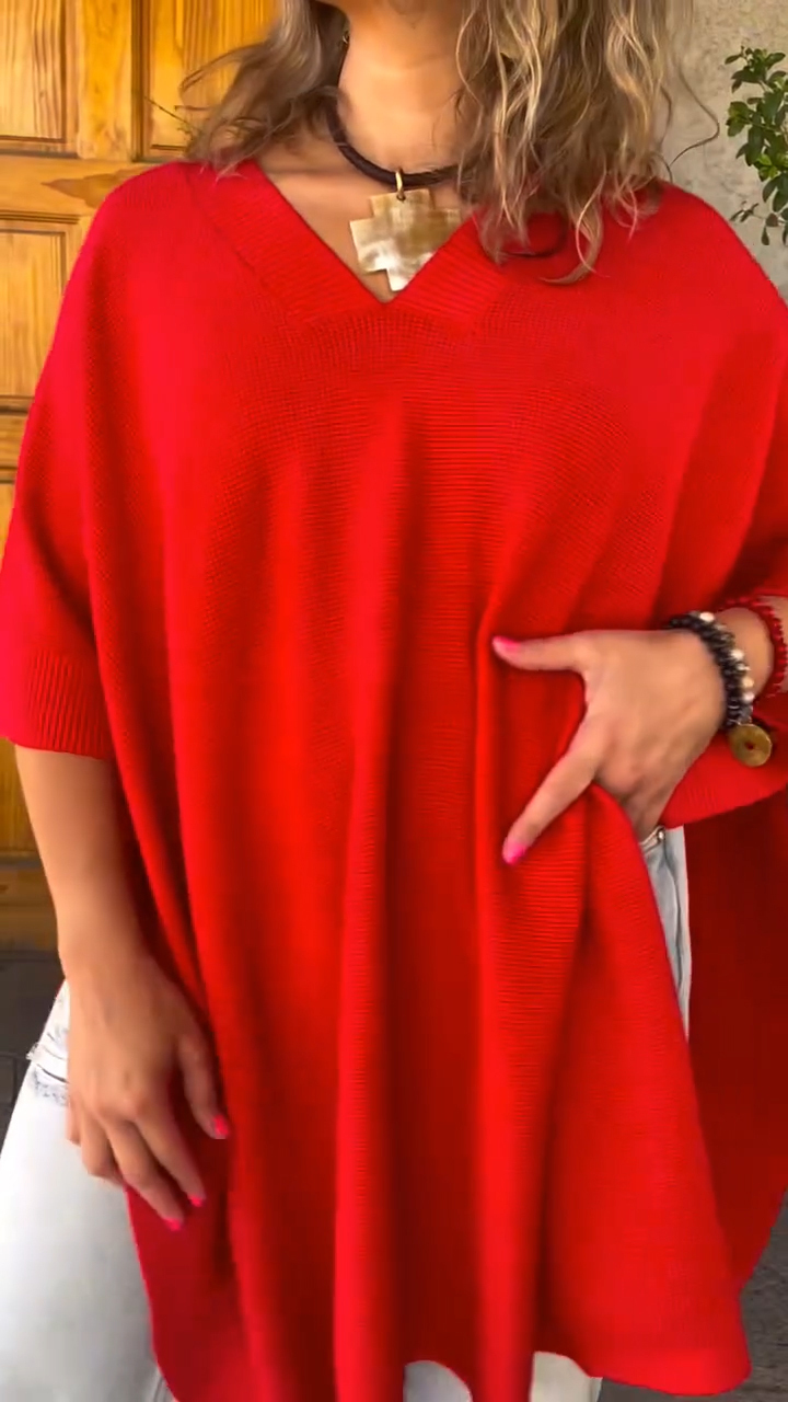 Step into a world of vibrant confidence with this red V - neck knit poncho top—a seamless blend of bohemian flair, cozy comfort, and striking allure for the woman who loves to make a bold fashion statement.