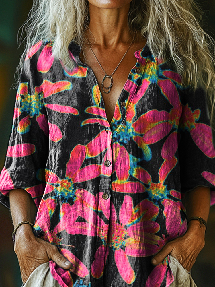 Women's Bohemian Floral Art Print Casual Cotton Linen Shirt