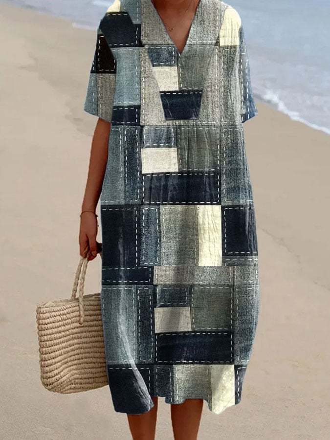 Women's Casual Retro Color Block Loose Short Sleeve Dress