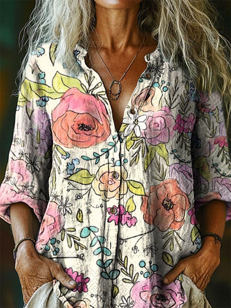 Women's Floral Pattern Art Print Casual Cotton Linen Shirt