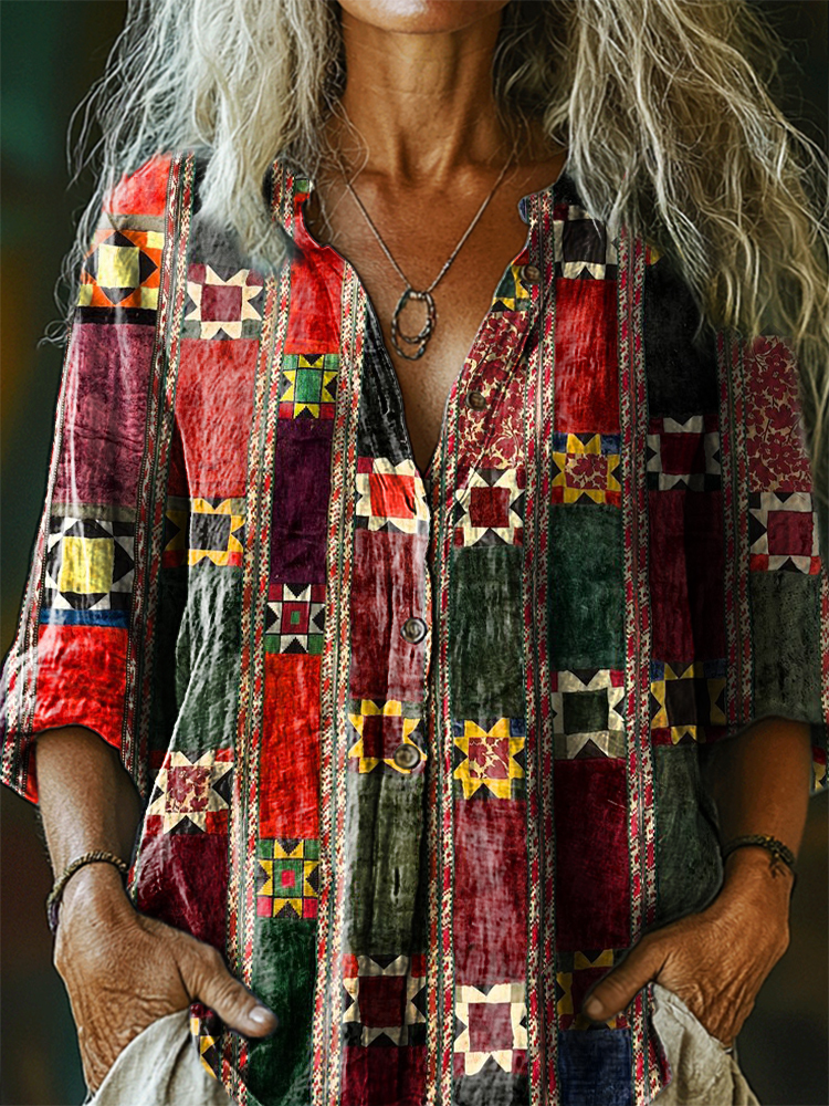 Women's Vintage Bohemian Floral Art Print Casual Cotton Linen Shirt