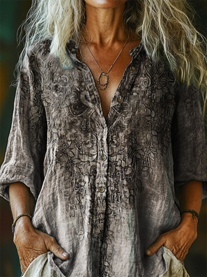 Women's Vintage Ethnic Floral Art Print Casual Cotton Linen Shirt