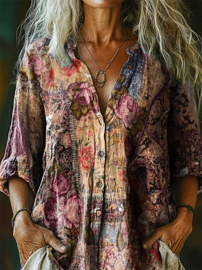 Women's Vintage Ethnic Floral Art Print Casual Cotton Linen Shirt