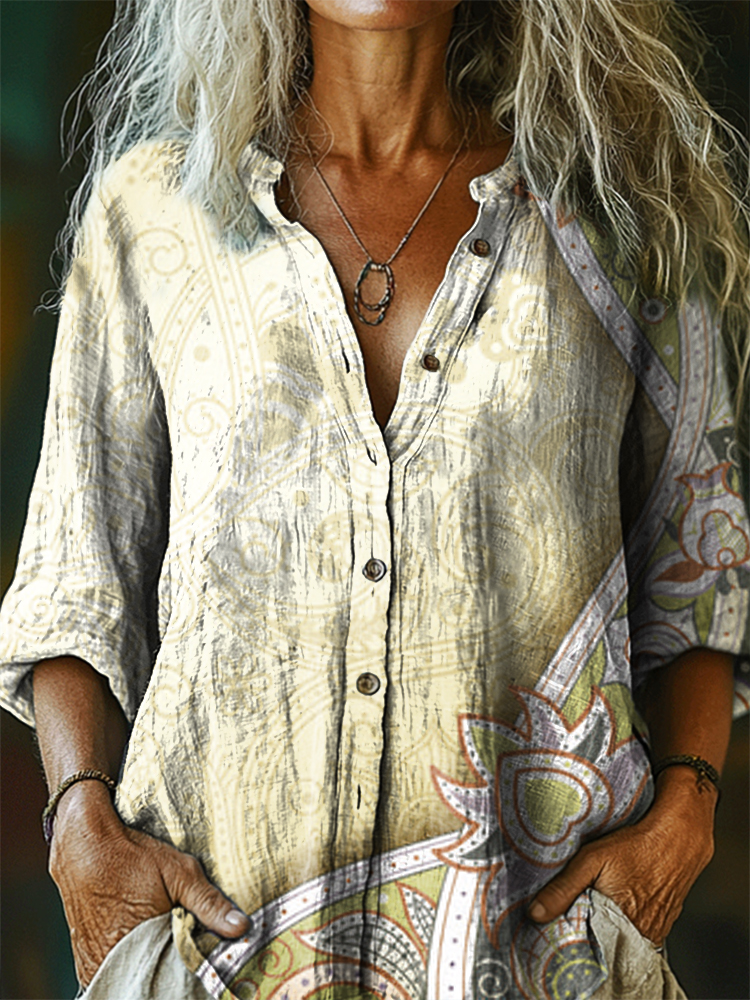 Women's Vintage Ethnic Floral Pattern Art Print Casual Cotton Linen Shirt