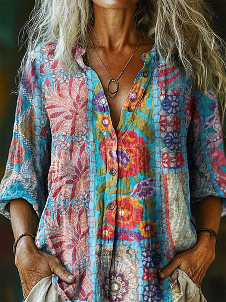 Women's Vintage Ethnic Floral Pattern Art Print Casual Cotton Linen Shirt