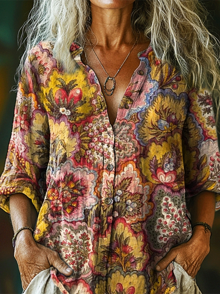 Women's Vintage Floral Ethnic Art Print Casual Cotton Linen Shirt