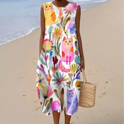 Women's Vintage Floral Cat Art Print Sleeveless Wrap Dress