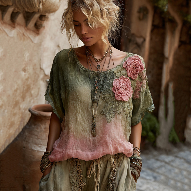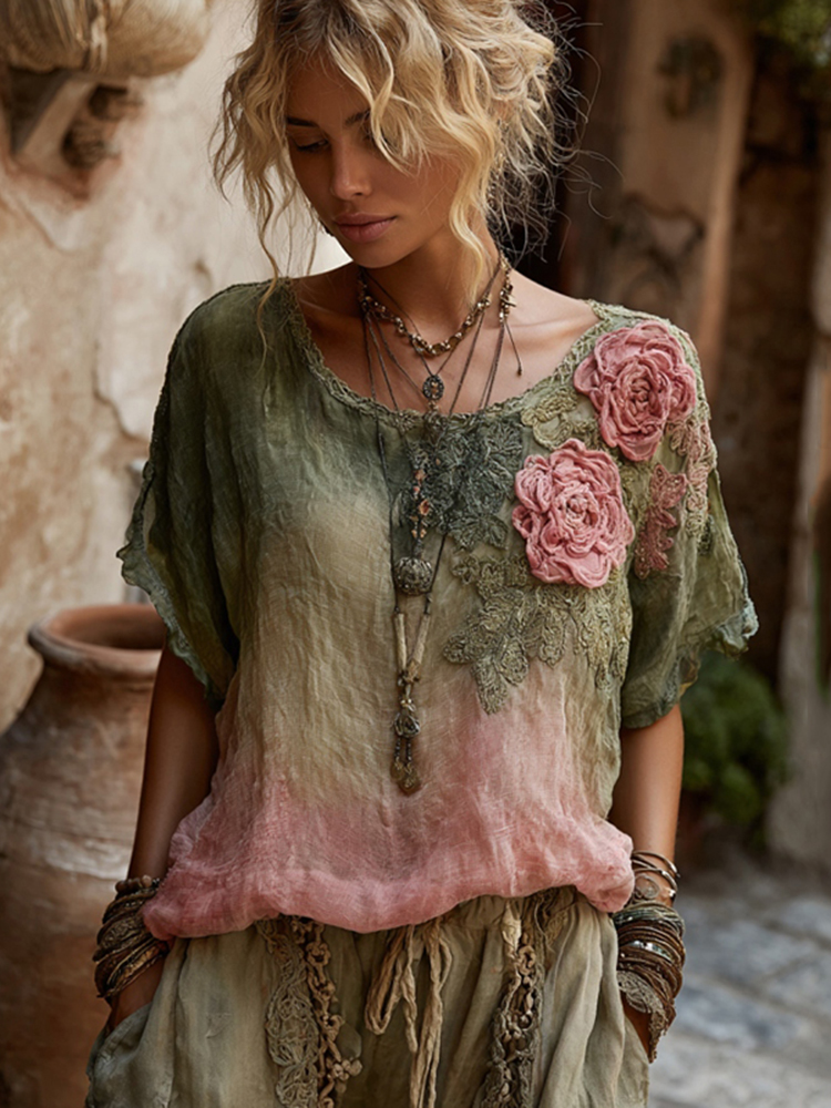 Vintage Pink Rose Art Gradient Pattern Linen T-shirt