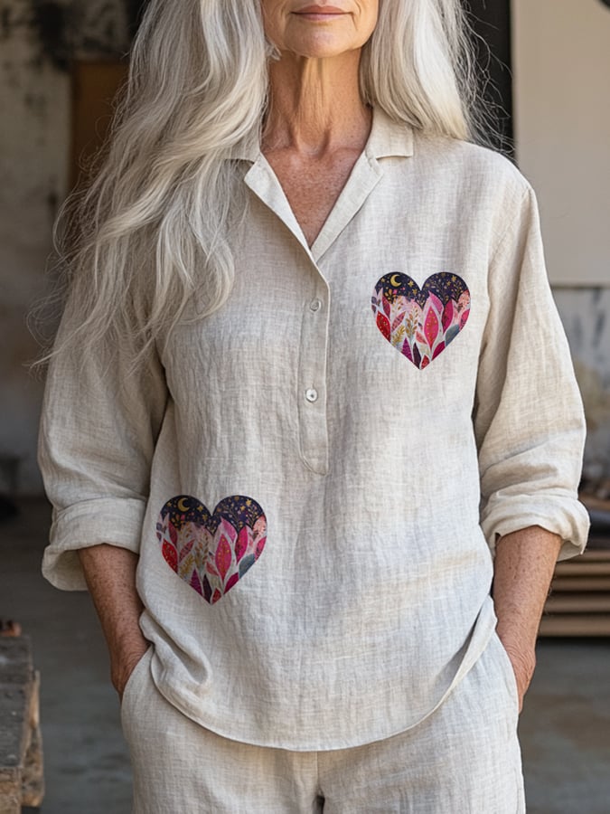 Women's Cotton and Linen Valentine's Day Heart Print Shirt