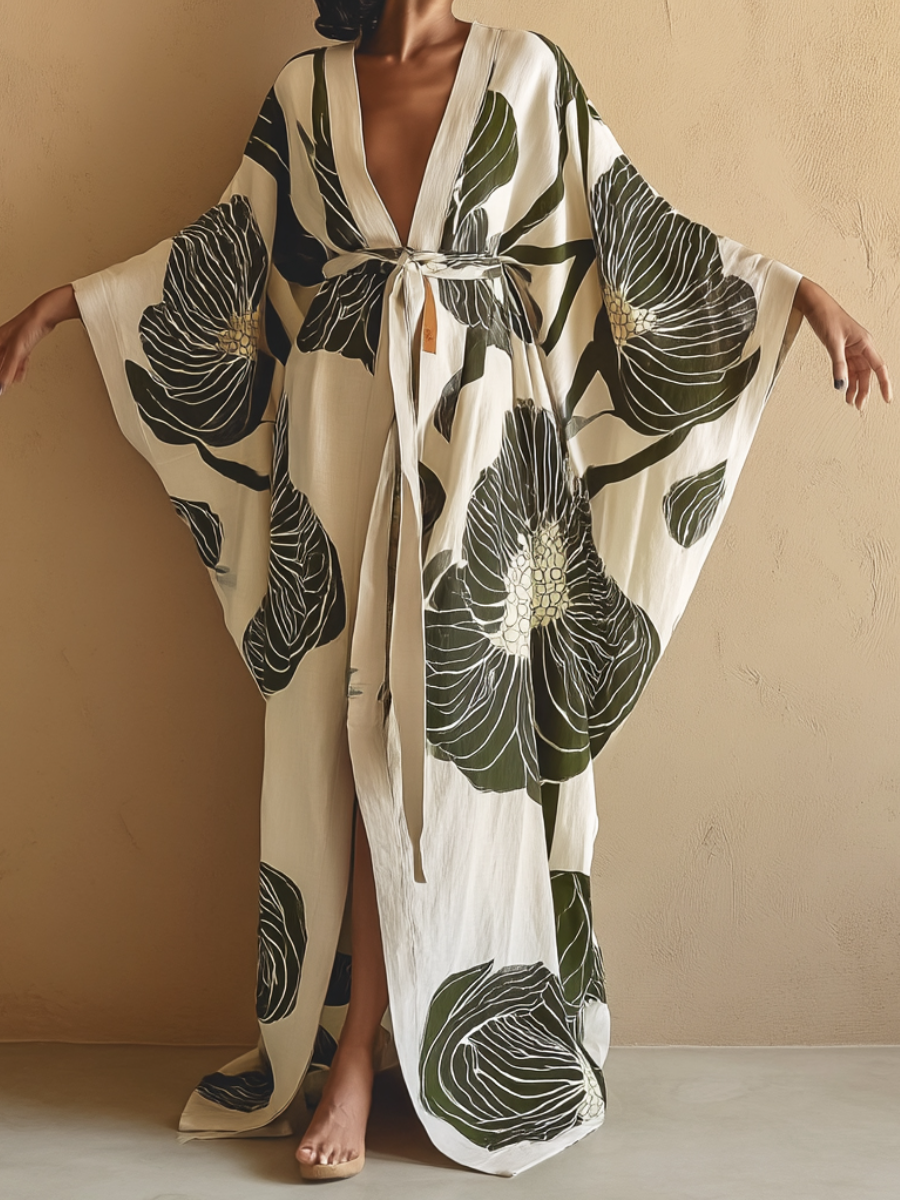 Chic design: The green flower pattern on a white background features traditional kimono-style sleeves and an elegant silhouette with a belt for a flattering fit.