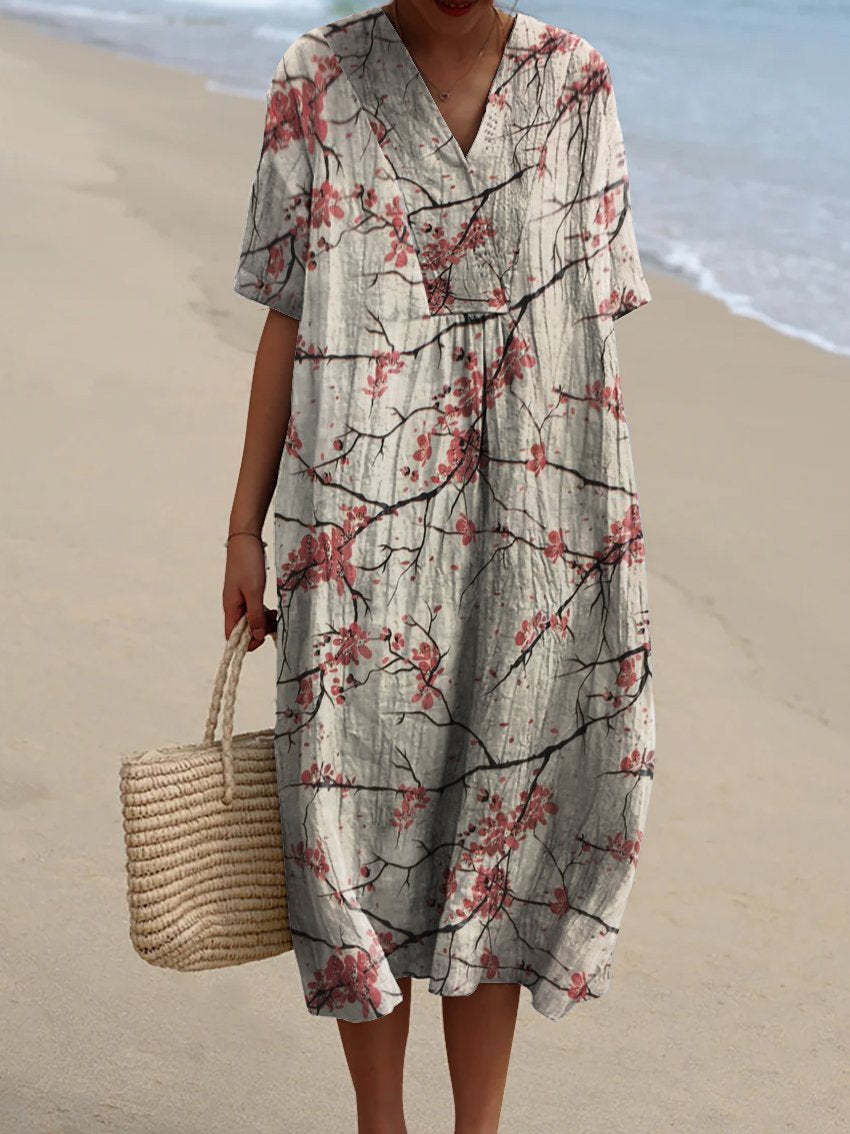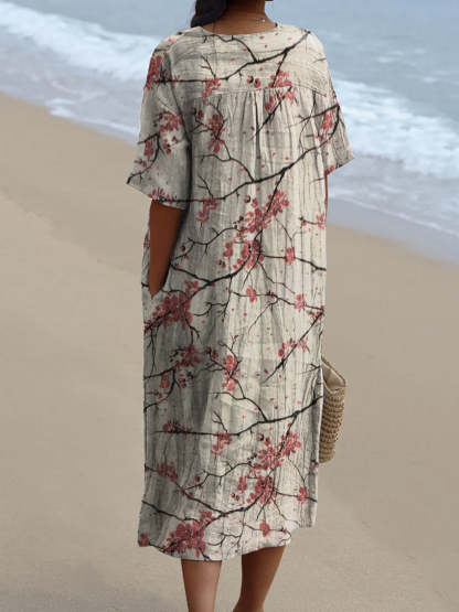 Women's Plum Blossom Print Pocket Linen Dress