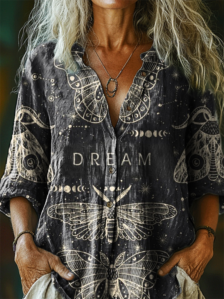 Women's Starmoon Butterfly Art Print Casual Cotton Linen Shirt