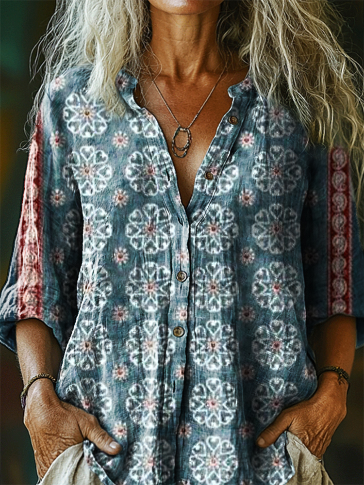 Women's Vintage Ethnic Floral Art Print Casual Cotton Linen Shirt