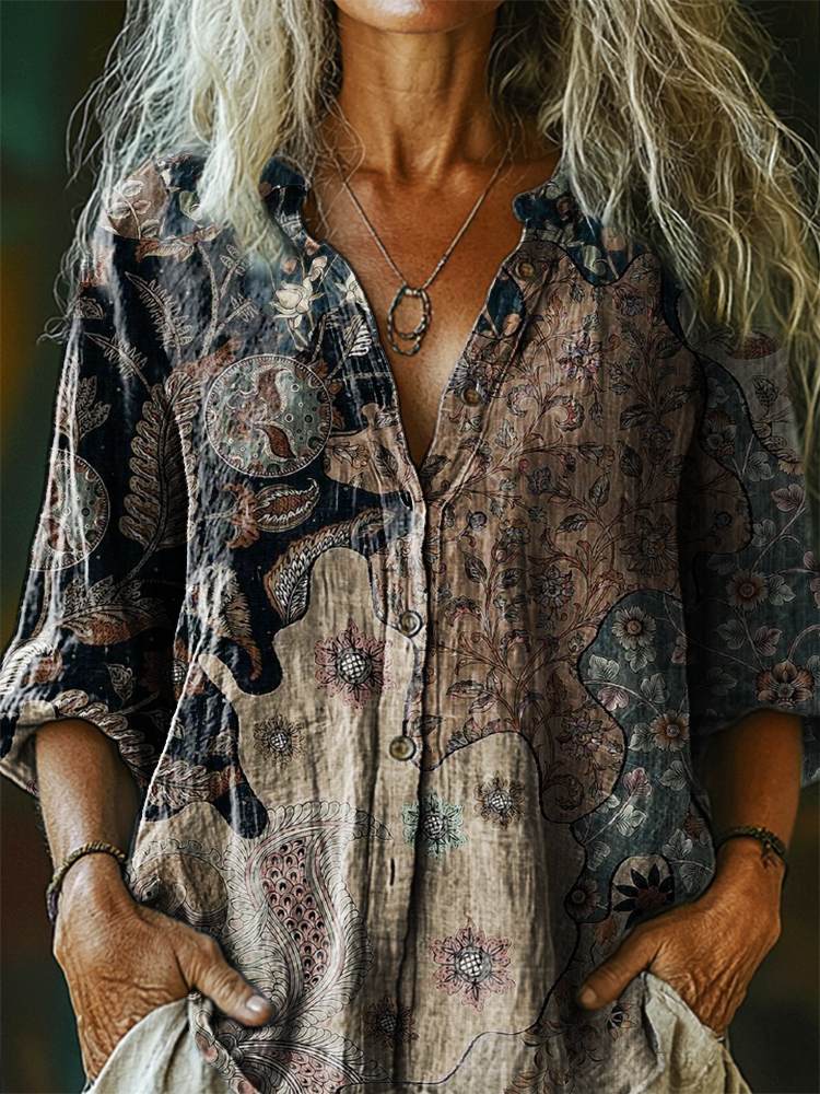 Women's Vintage Bohemian Floral Art Print Casual Cotton Linen Shirt