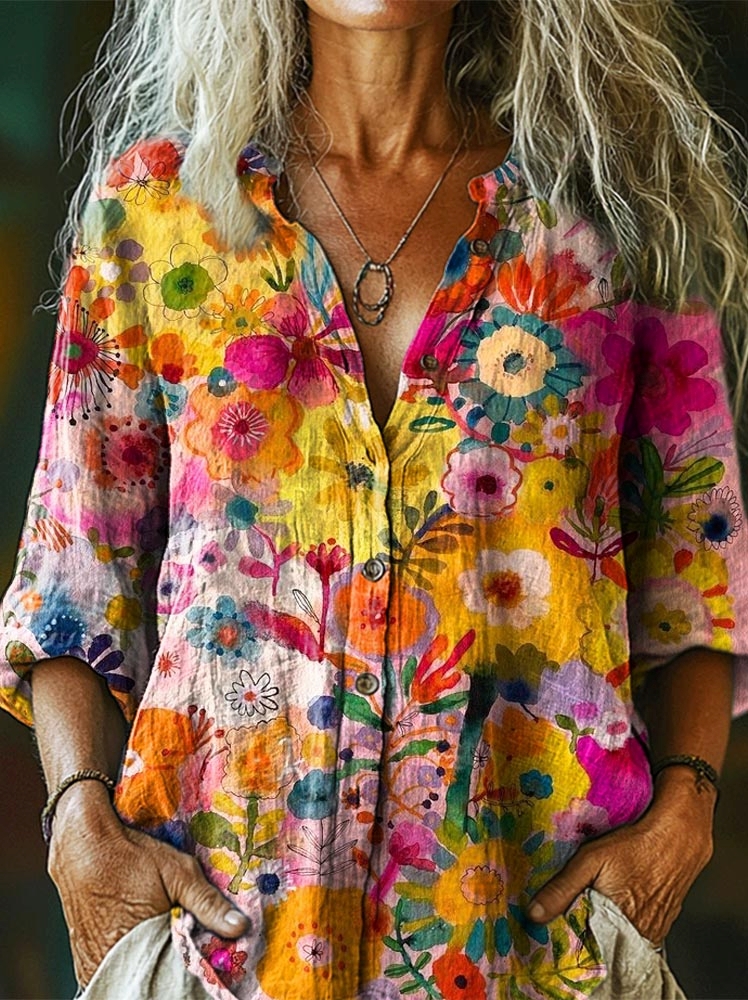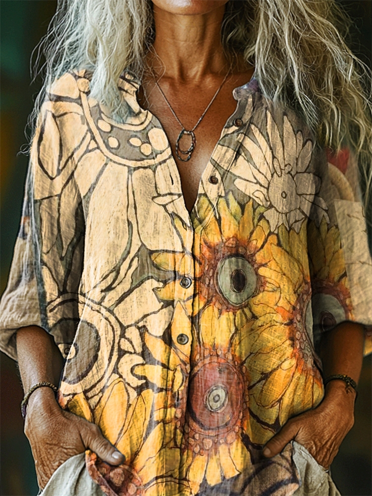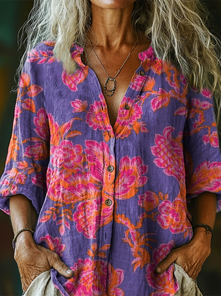Women's Bohemian Floral Art Print Casual Cotton Linen Shirt