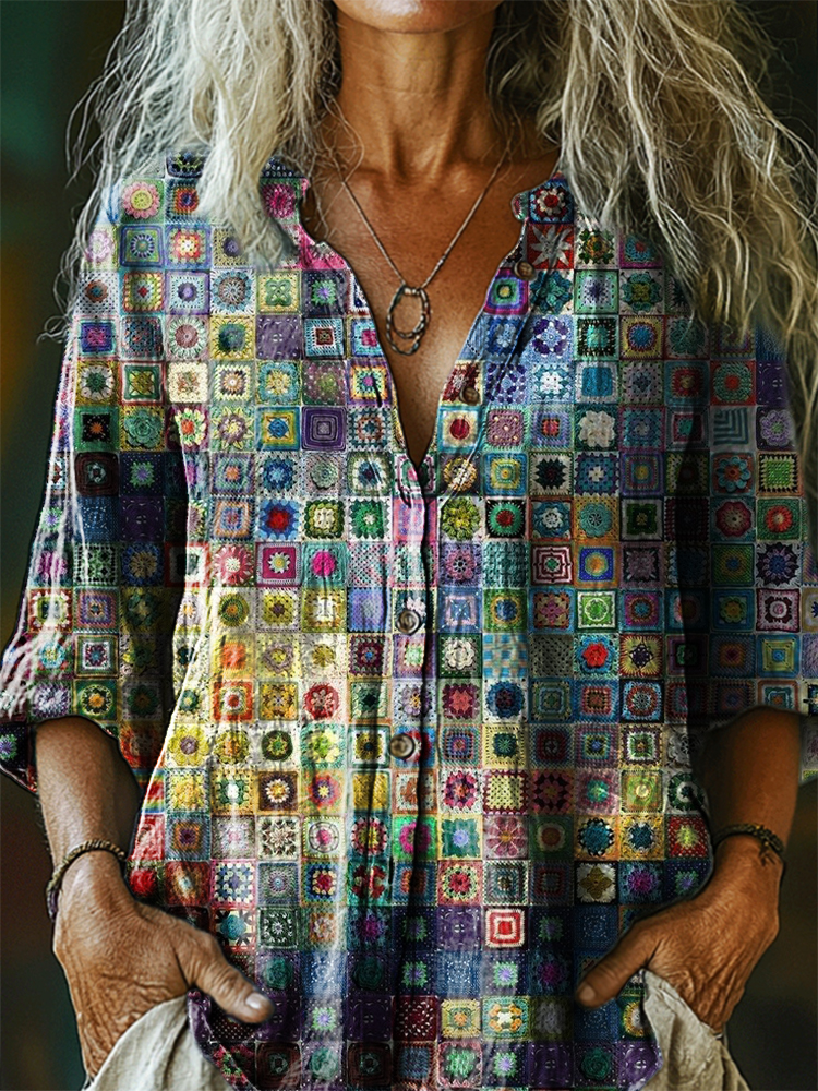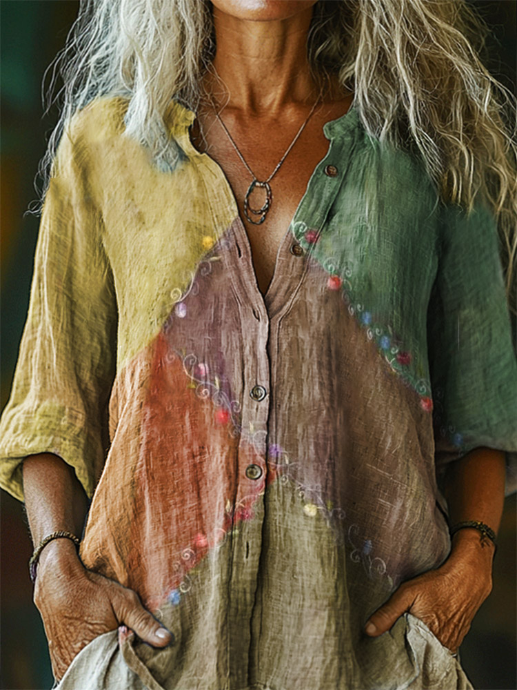 Women's Retro Colorful Patchwork Art Print Casual Cotton Linen Shirt
