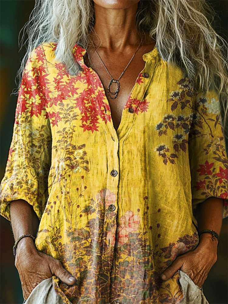 Women's Vintage Floral Art Print Casual Cotton Linen Shirt