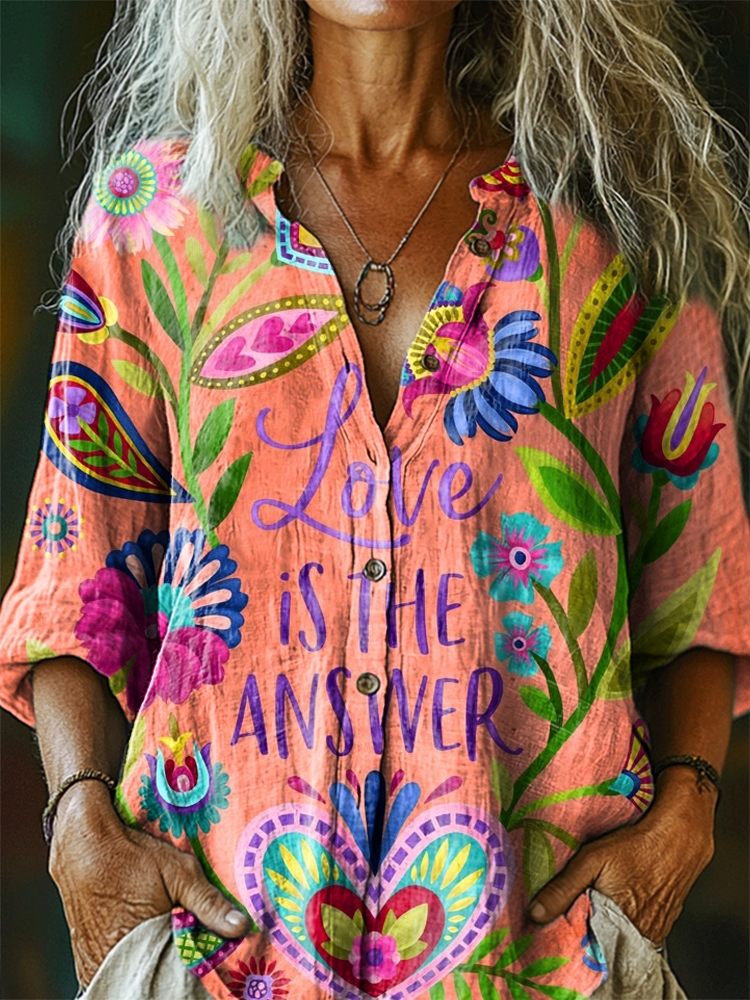 Women's Love Is The Answer Pattern Art Print Casual Cotton Linen Shirt