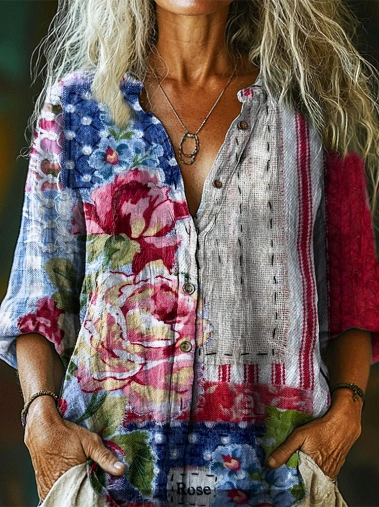 Women's Bohemian Floral Collage Art Print Casual Cotton Linen Shirt