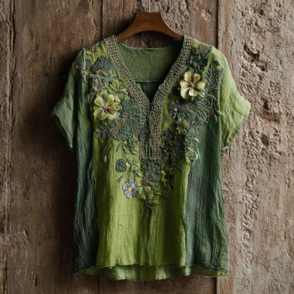 Bohemian-style Tropical Rainforest Three-dimensional Flower Embroidery Grass Green V-neck Short-sleeved Shirt