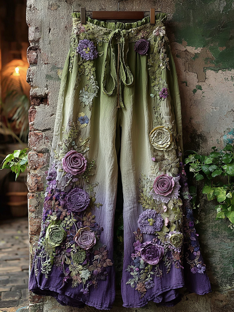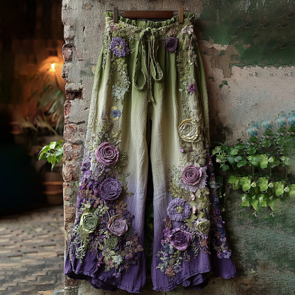 Classy Purple Lavender And Floral Embroidered Art Linen Pants