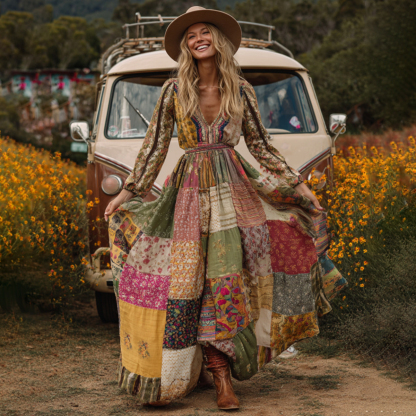 Countryside Style Collection Classy Patchwork Floral Pattern Art Linen Long Sleeve Maxi Dress