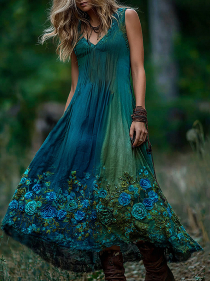Vintage Classy Gradient Blue Rose And Floral Embroidered Linen V Neck Maxi Dress