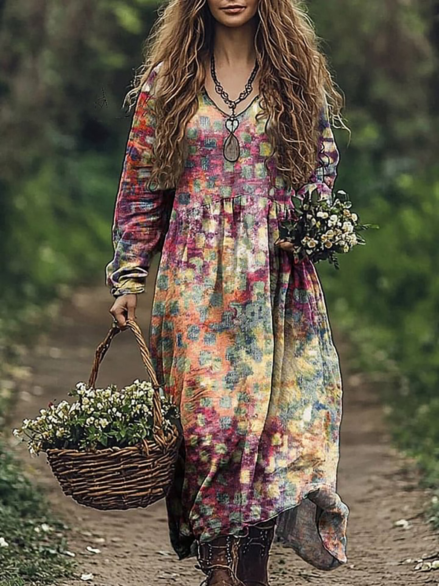 Women's Bohemian Art Print V Neck Pocket Cotton Dress