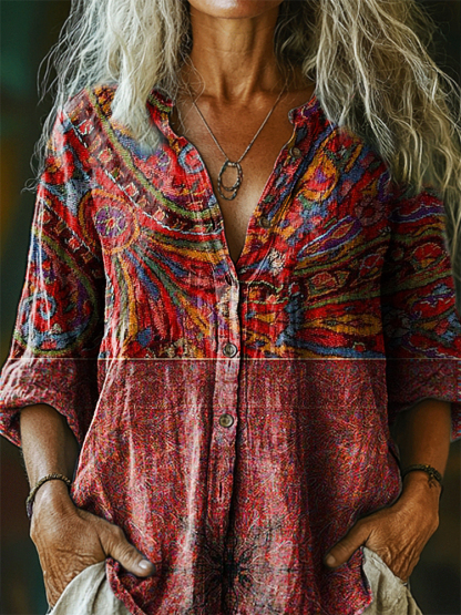 Women's Bohemian Floral Art Print Casual Cotton Linen Shirt