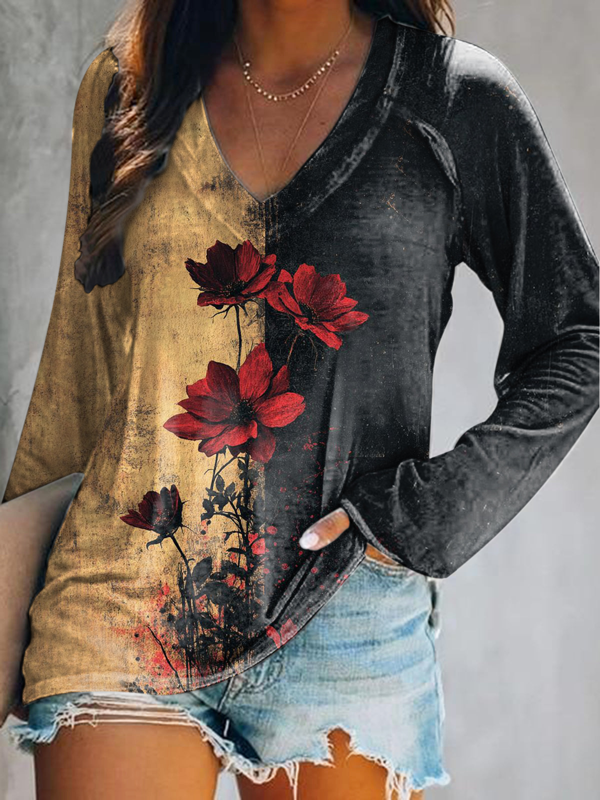 Women's Casual Retro Rose Flower Art Print V Neck Long Sleeve Tops