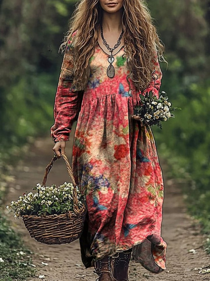 Women's Floral Butterfly Art Print V Neck Pocket Cotton Dress