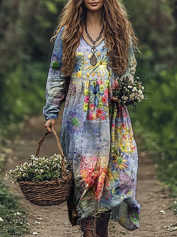 Women's Patchwork Pattern Print V Neck Pocket Cotton Dress