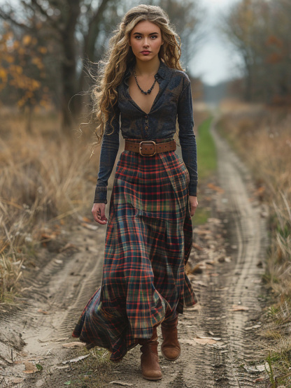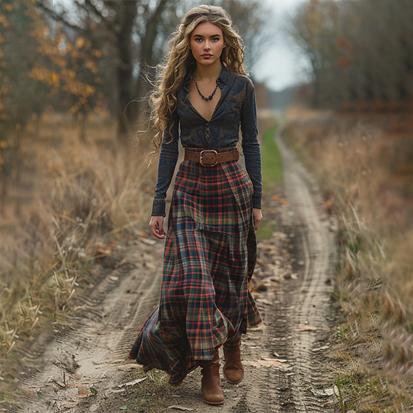 Women's Retro Pastoral Cotton And Linen Plaid Print Skirt