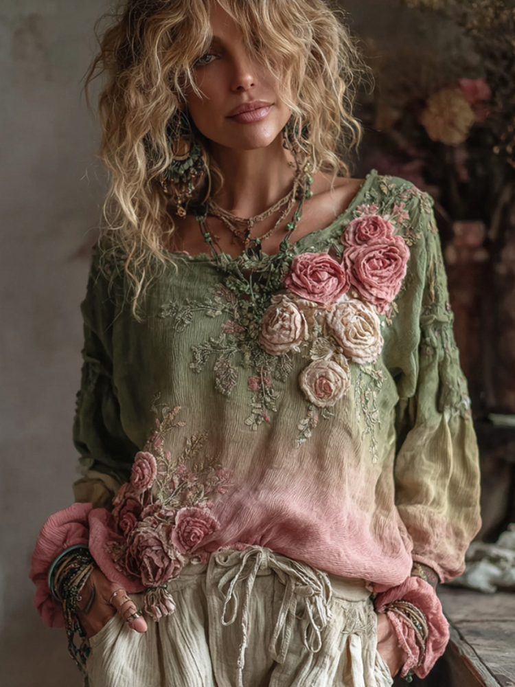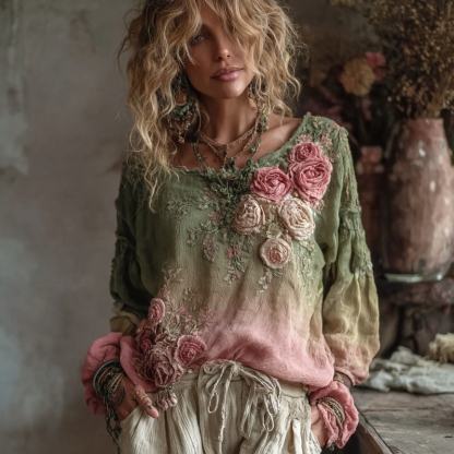 Women's Rose Embroidery Art Long Sleeve Loose T-shirt