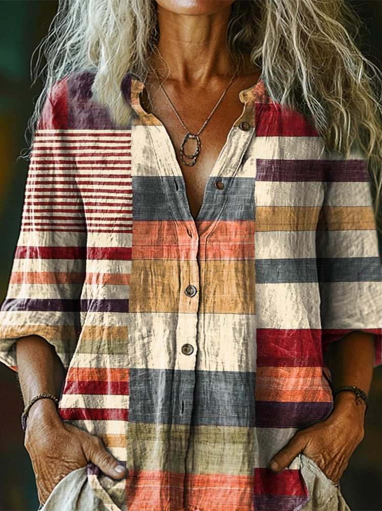 Women's Striped Color Clash Art Print Comfortable Long Sleeve Cotton Shirt