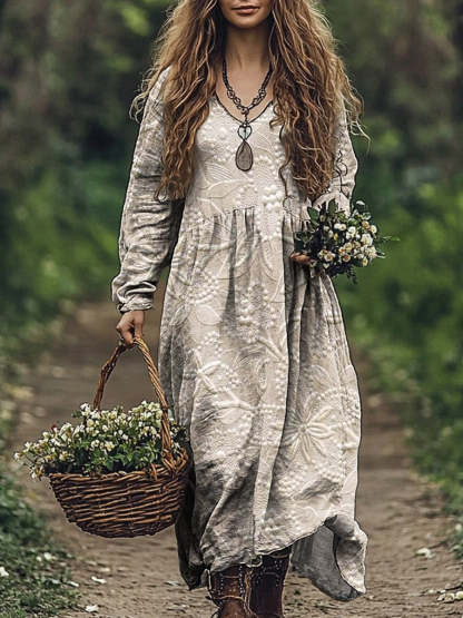 Women's Textured Floral Art Pattern Print V Neck Pocket Cotton Dress