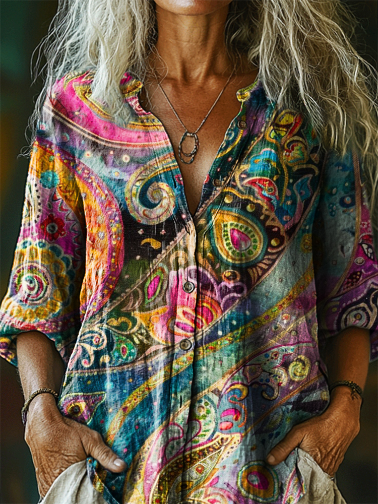 Women's Vintage Bohemian Floral Art Print Casual Cotton Linen Shirt
