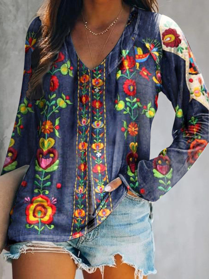 Women's Vintage Bohemian Floral Art Print Casual V Neck Long Sleeve Tops