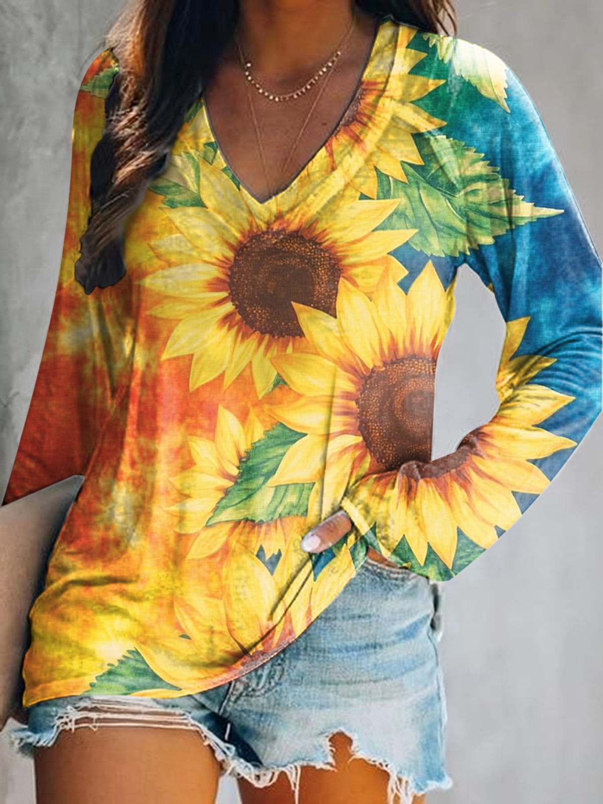 Women's Vintage Bohemian Sunfloral Art Print Casual V Neck Long Sleeve Tops
