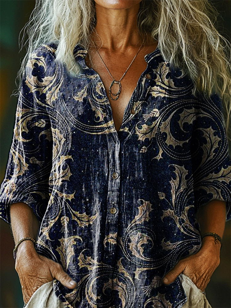 Women's Vintage Ethnic Floral Art Print Casual Cotton Linen Shirt