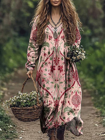 Women's Vintage Folk Floral Art Print V Neck Pocket Cotton Dress
