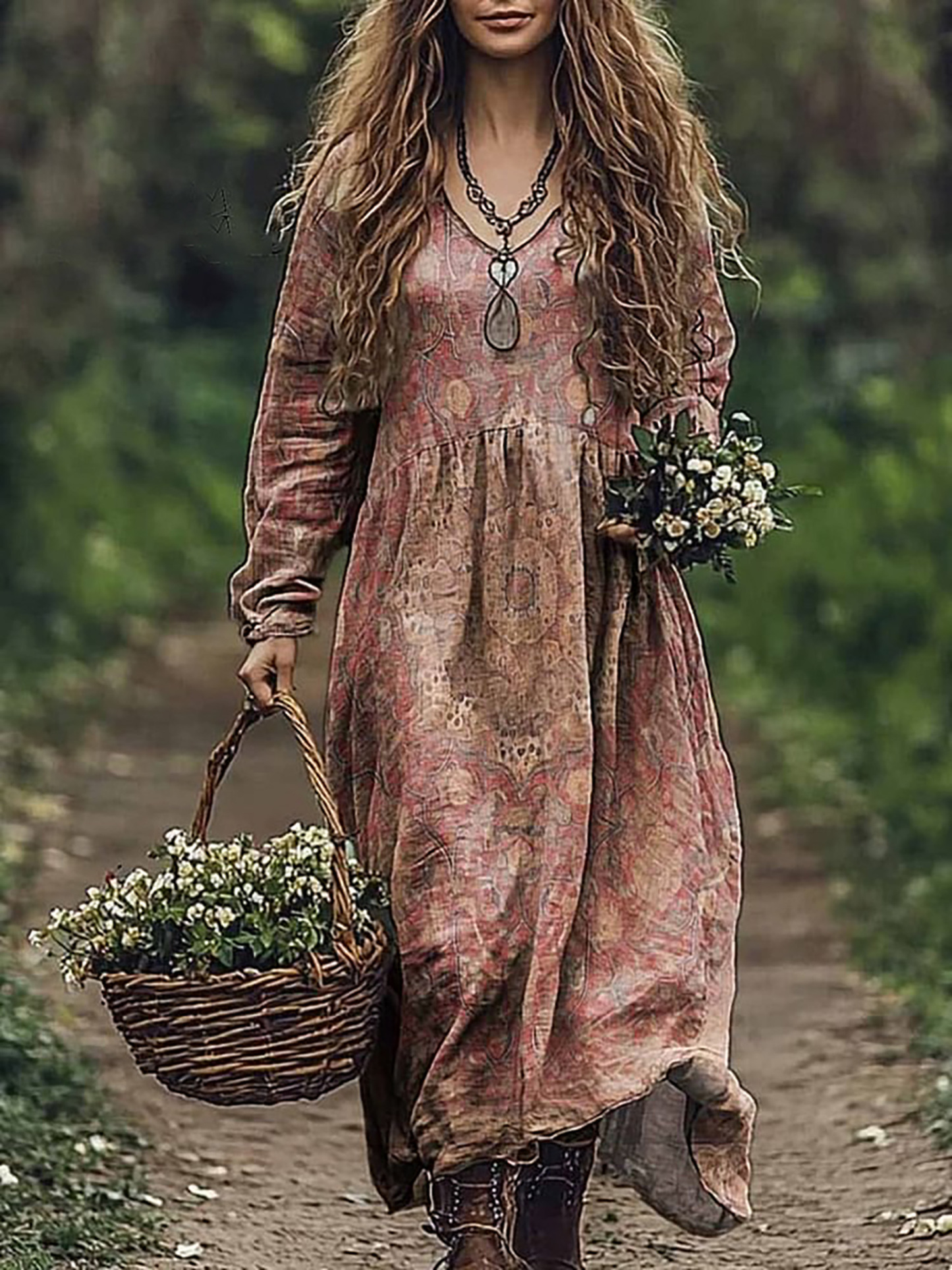 Women's Vintage Folk Floral Print V Neck Pocket Cotton Dress